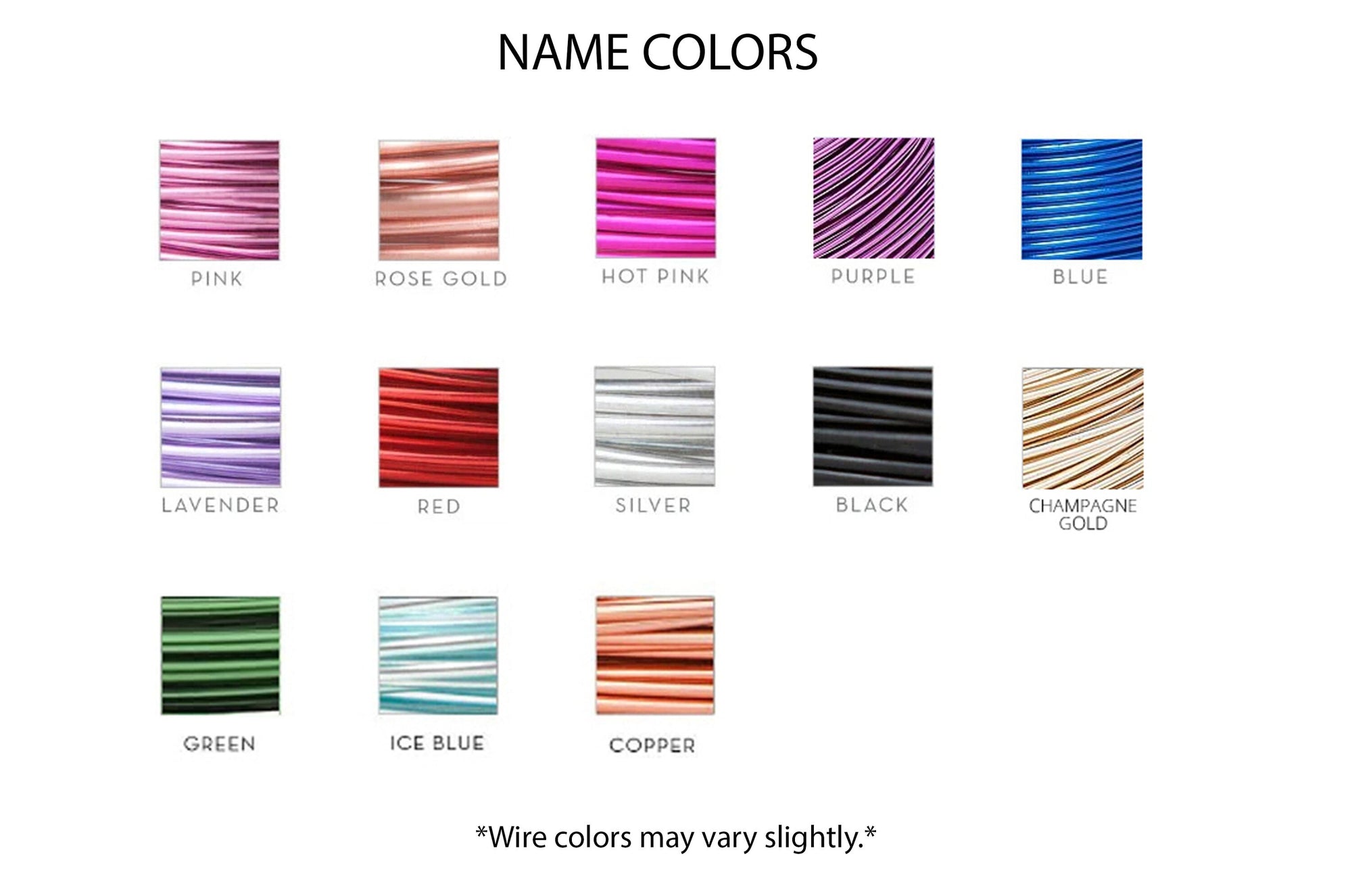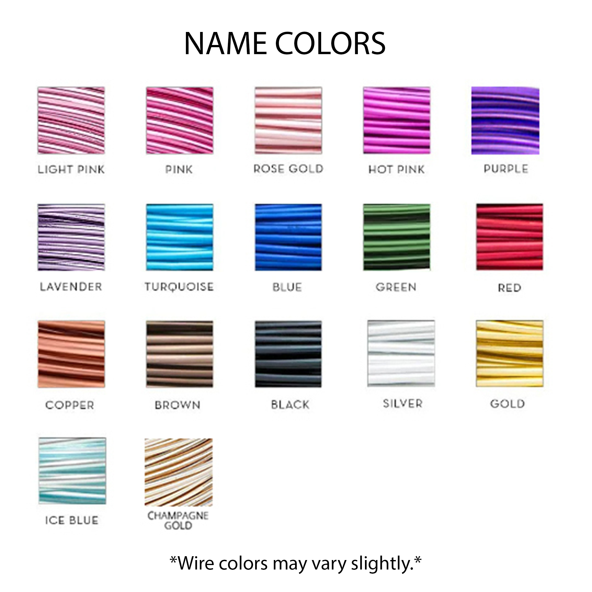 Personalized cat ornament, image shows the cat ornament done in rose gold wire that forms the outline of a cat's body and head with a white bow and a tiny silver bell. In the center of the ornament is personalized with ice blue colored wire with the name Ellie.
