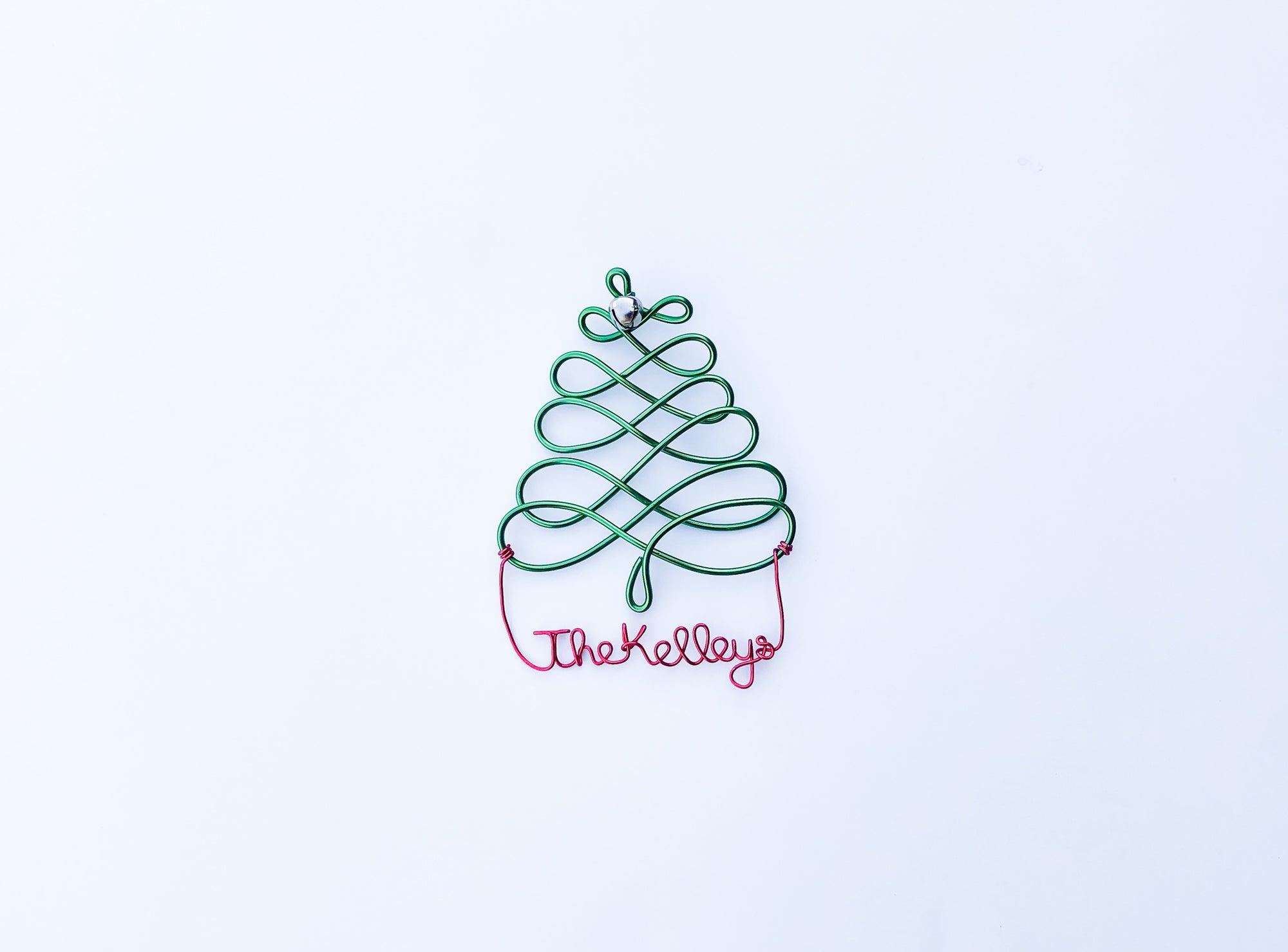 Personalized dog ornament in silver aluminum wire a dog bone outline and the name Mila in red aluminum wire, The background is white that has christmas tree branches.