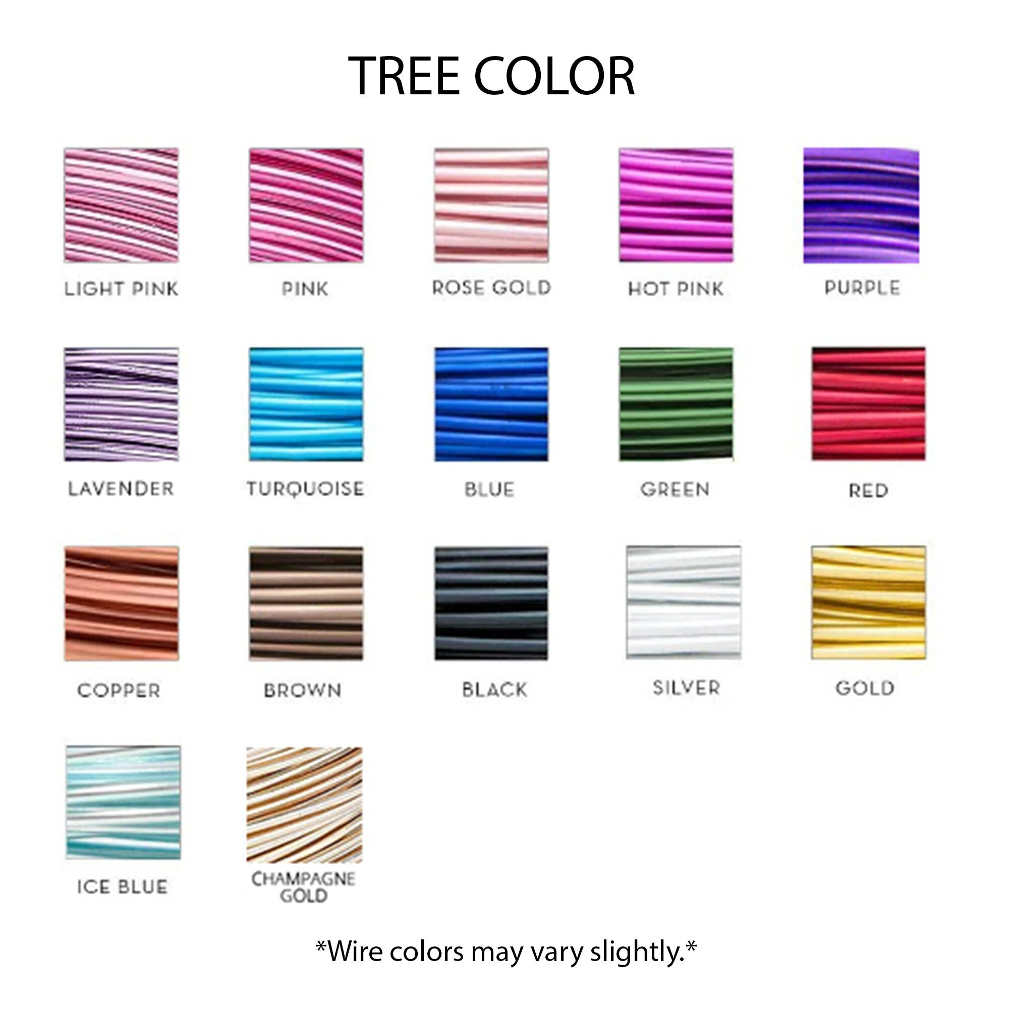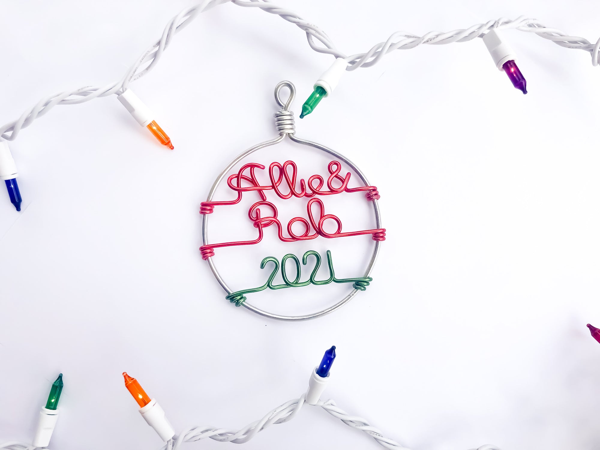 A wire-wrapped baby stroller ornament, featuring the name "Ella" and the year "2021", is nestled among a string of colorful Christmas lights.